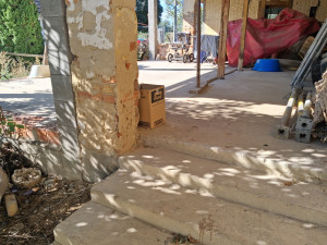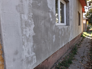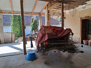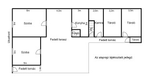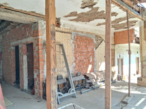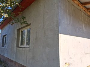A hetvenes években épült polgári jellegű, vegyes falazatú ház, kiemelt, magas lábazaton áll. Elkezdődött, de félbemaradt a felújítása, átépítése. A külső homlokzatot részben újra vakolták és hőszigetelték. Az utcafronti két nagy szobára új műanyag ablakokat tettek. Egy szenzációs méretű és fekvésű, fedett, 82 nm-es terasz helyezkedik el az épület központi részén. A két szobán kívül, két további helység nyílik ugyanerre a teraszra, amit konyhának és fürdőszobának terveztek. A padlásfeljáró után következik, egy 7, egy 14, egy 16 és egy 2 négyzetmétres kamra, vagy tároló. Sok célra alkalmasak lehetnek, akár még egy lakás kialakítható bennük. Ezek a helyiségek egy 12 nm-es fedett folyosóról közelíthetők meg. A kiskaputól a hatalmas fedett teraszig, szintén száraz út vezet, egy 8 nm-es, fedett folyosón keresztül.