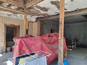 A tetőt újra rakták, a lakás felett, egészen a padlásfeljáró vonaláig, egészen a kamrákig és tárolókig.